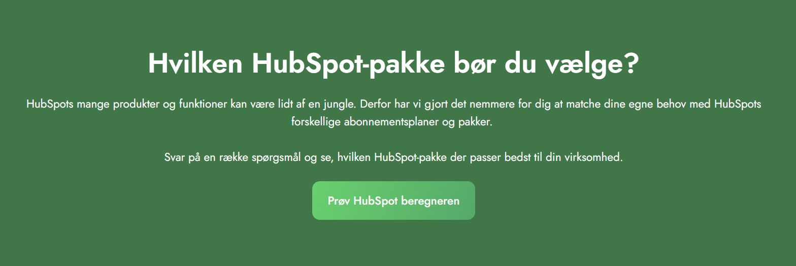 Af den grund kan det være svært at finde frem til, hvad din pris bliver for HubSpot. Derfor anbefaler vi altid, at du kontakter os, så vi kan hjælpe dig med at behovsafdække. Skal man eks. bruge marketing automation, skal man som minimum bruge HubSpot Marketing Professional-løsningen.